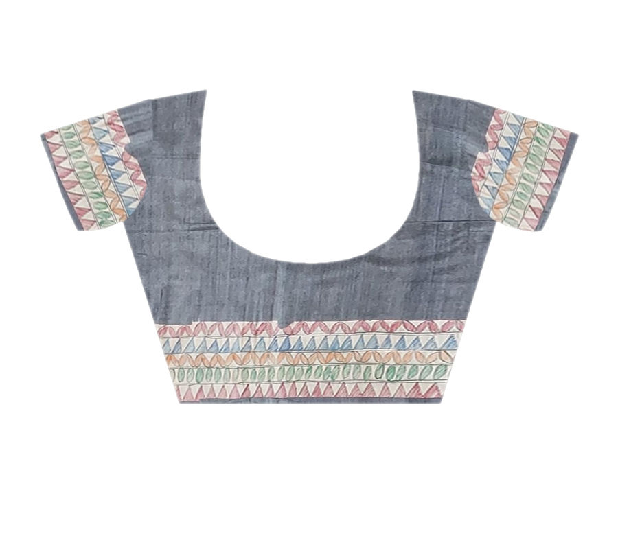 - Tussar Gitcha Silk saree with table dyed on handpainted Madhubani Pattern on Pallu and border.