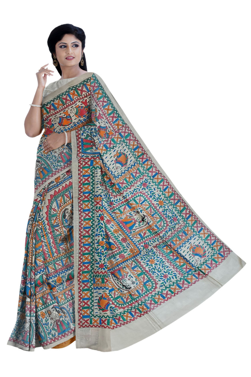 - Shiny Tussar silk saree with handpainted madhubani patterns on border and pallu.